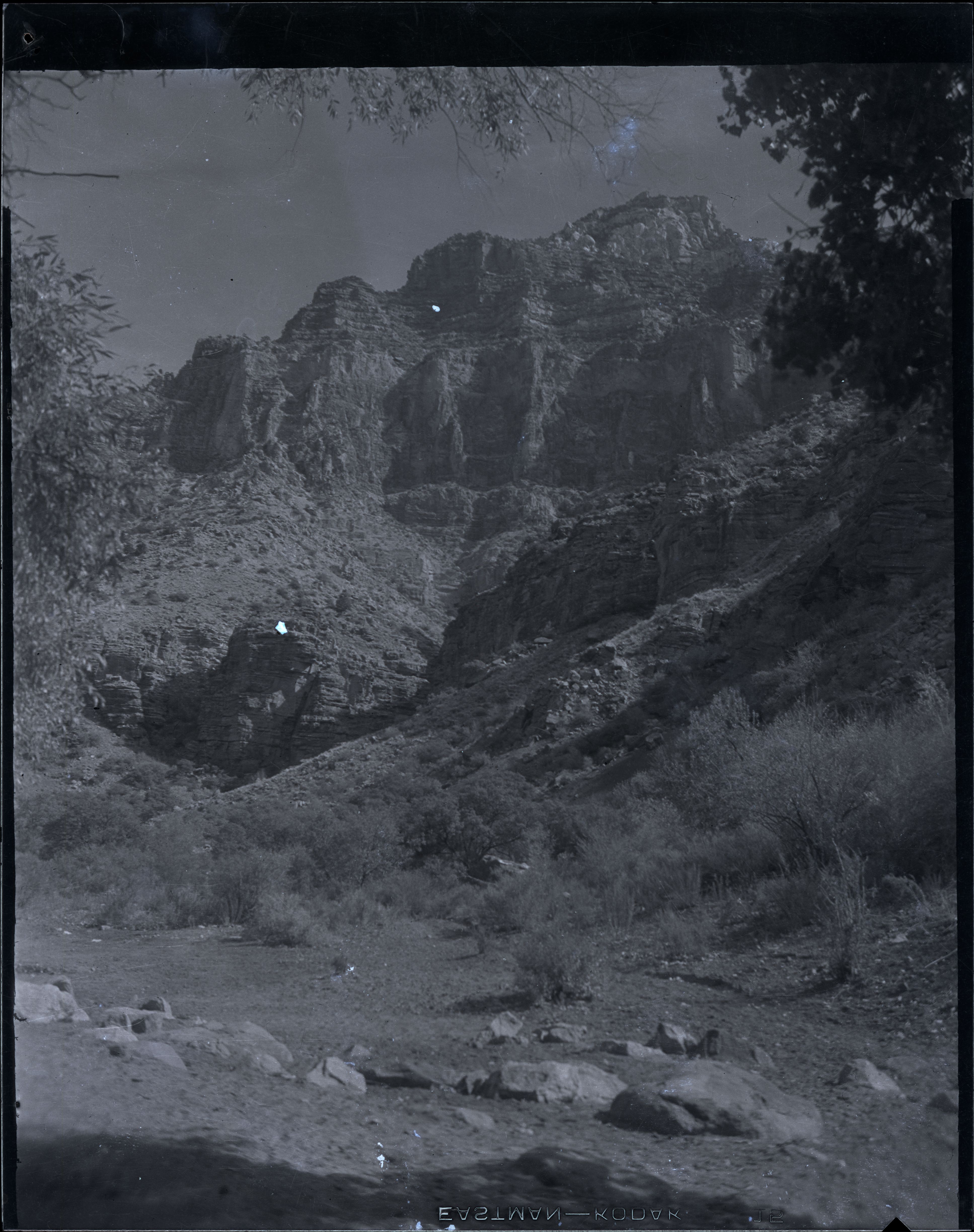 Nitrate negative of canyon walls from drainage in ZION. Trees framing edge of image. ; BRCA Museum and Archives Image BRCA8875_001_345 ; BRCA 8875