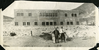 Albert M. Johnson with unidentified man and two girls. In front of newly constructed Scotty's Castle Main House before second phase of construction / remodeling occurred. Circa 1922. Black and white, horizontal format. Mounted with black photo corners on album page.