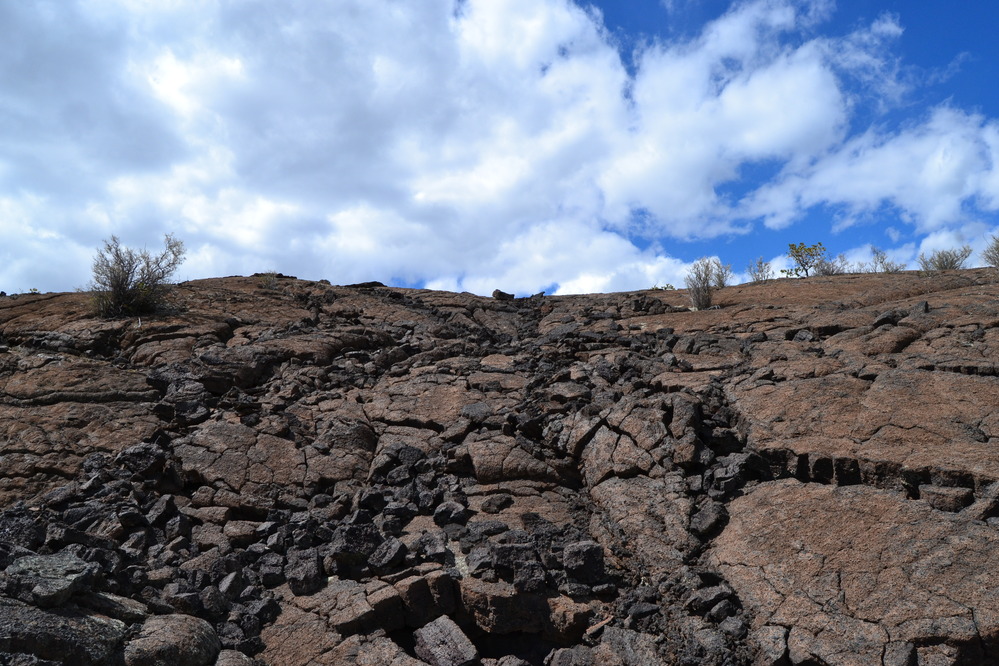 A ridge of reddish-black rock slabs and boulders reaches to the sky. Cracks and small rocks stretch in all directions below the clouds.