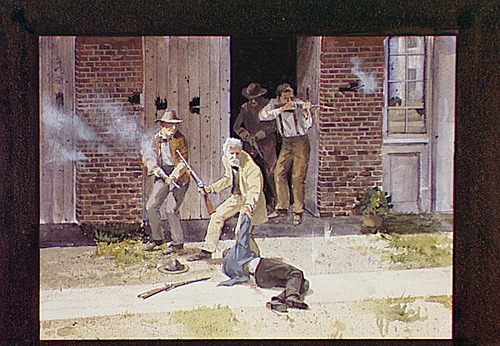 This scene may depict Watson Brown, John Brown's son, dragging himself back to the enginehouse after being mortally wounded while under a flag of truce.