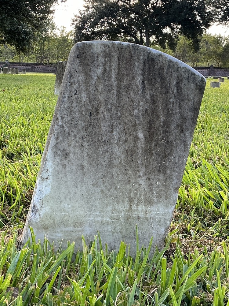 Back of historic upright marble headstone with recessed shield face.