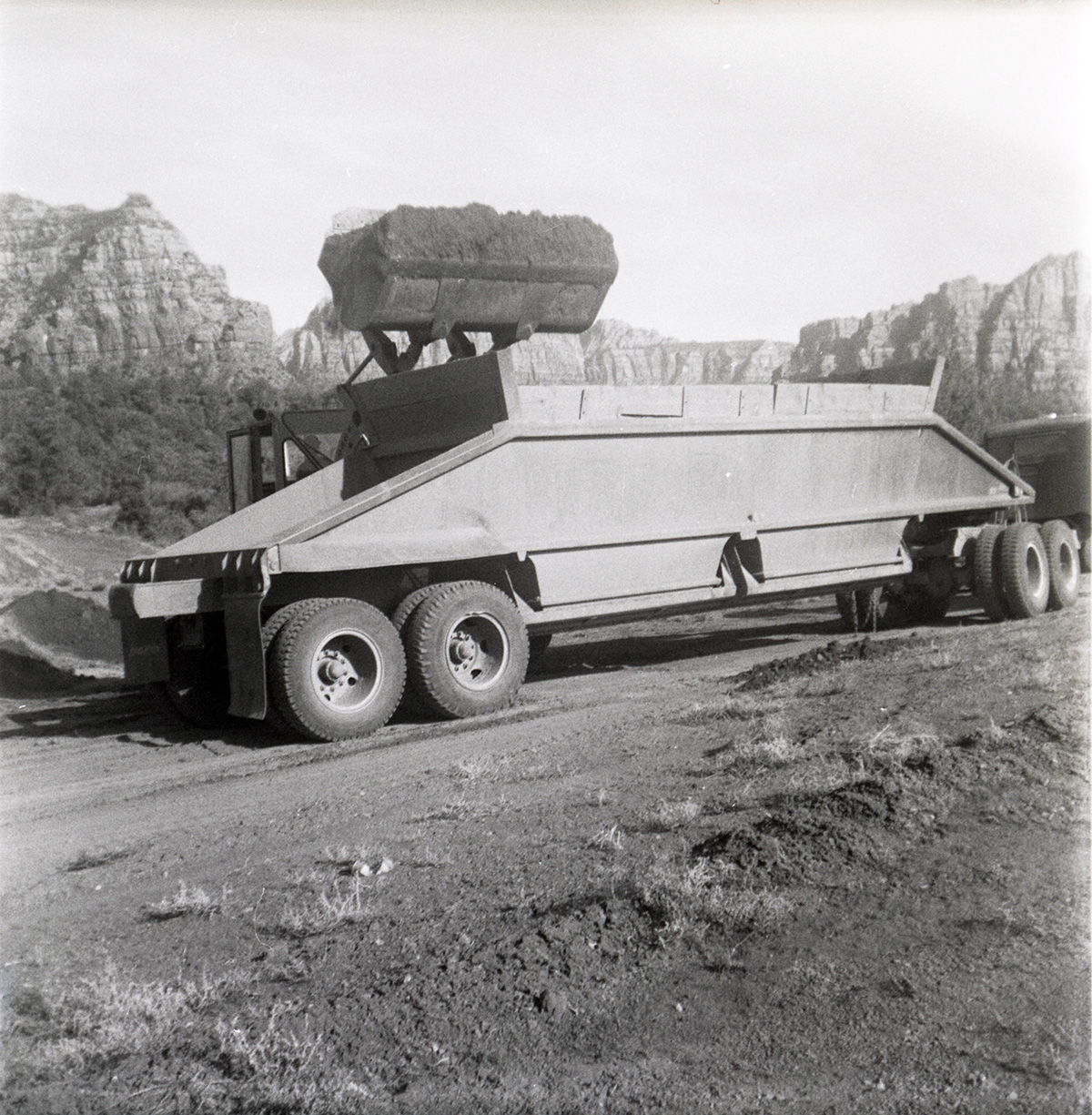 Construction truck during road grading to Chamberlain Ranch and the Narrows. ; ZION Museum and Archives Image 002.13.04-5of12 ; ZION 15933