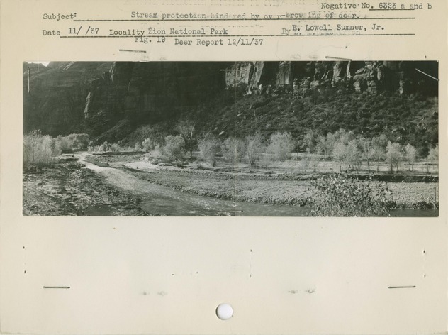 Stream protection hindered by over-browsing of deer (Figure 19 Deer Report 12/11/1937). Locality: Zion National Park. Negative #: 6323_1-2