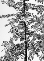 This pen and ink drawing shows the trunk of a western hemlock tree with thin, needle covered, branches.