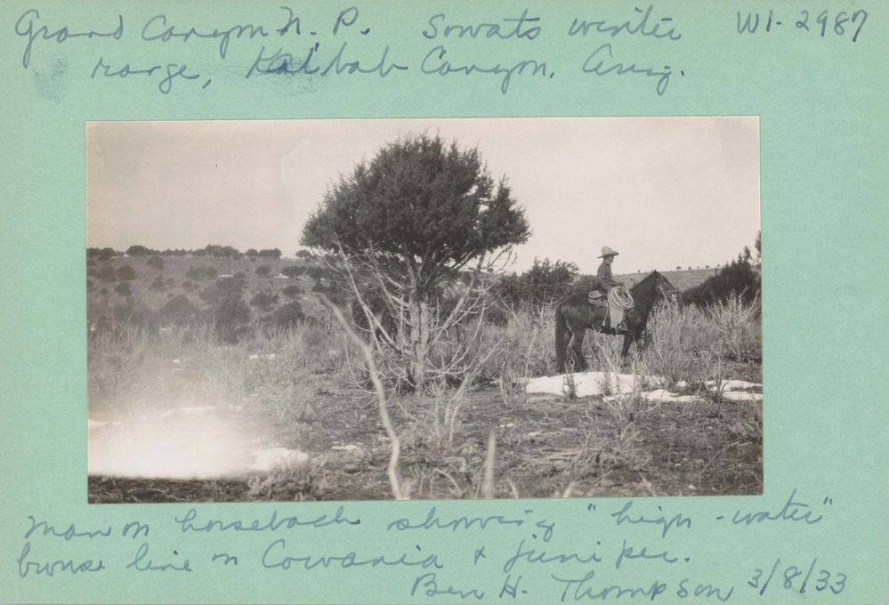 Scenery: Man on horseback showing “high-water” burn line in Cowania and Juniper. Negative #: 2987. Locality: Grand Canyon National Park, Sowats winter range, Kaibab Canyon, Arizona.