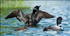 You may know the great northern loon as the common loon (Gavia immer). These adults are still in breeding plumage, with a black head, white underparts and a checkered black-and-white mantle. After breeding season the plumage returns to shades of brown with a white chin and foreneck. From a distance you may be able to easily see recognize the common loon by its horizontal bill positioning. Amazingly, the loon has a number of solid bones, which is very unlike the normally-hollow avian bones. This extra weight aids in the loon's diving prowess but may also be one of the reasons the bird requires a long distance to gain momentum for flight take-off. Loons have the ability to dive as deep as 60 meters (200 feet) for as long as 3 minutes. Like all divers, this species is a specialist fish-eater.