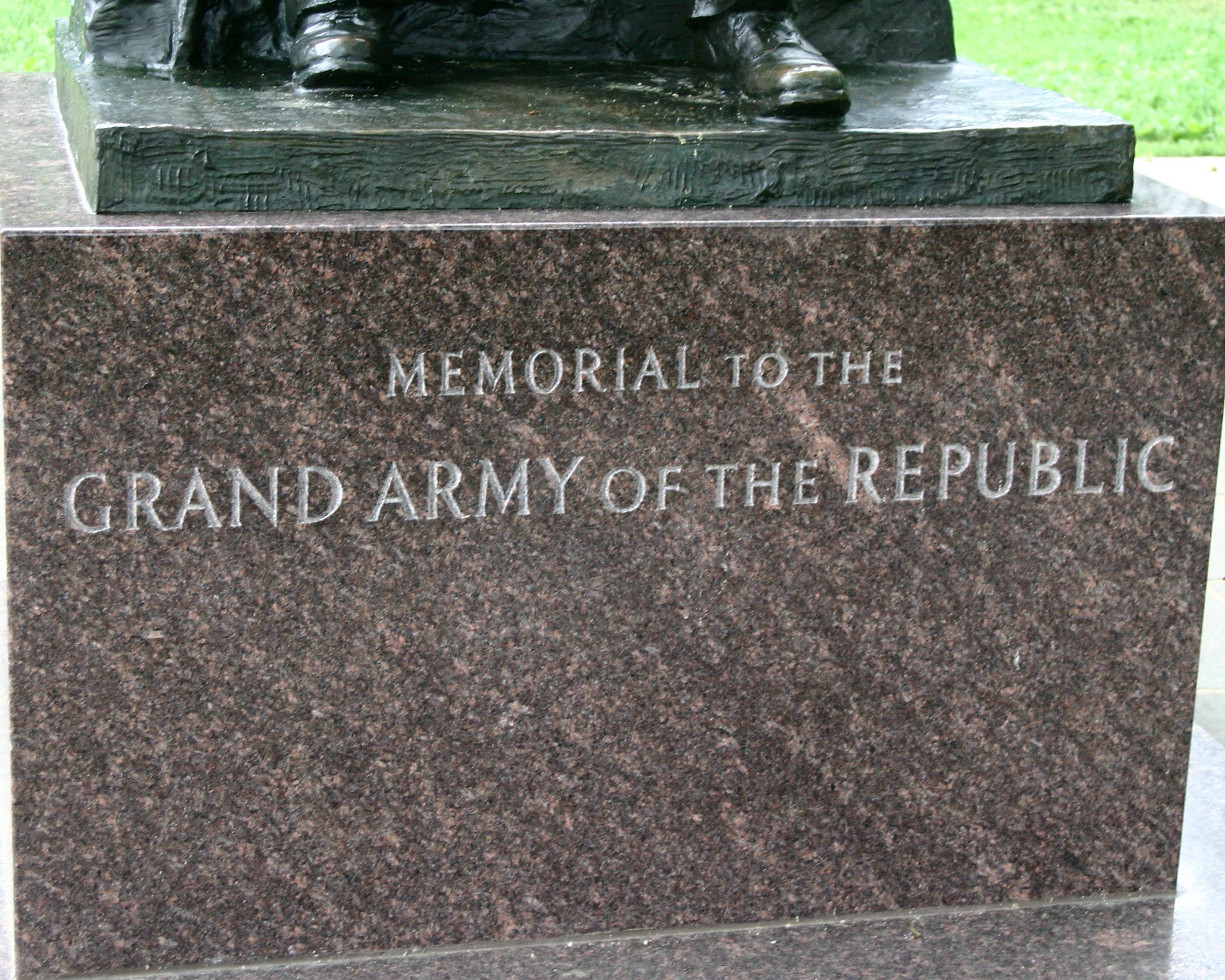 1 of 16 bronze statues. Commemorates last survivor of the Grand Army of the Republic. Located N Hancock Avenue north of cyclorama. || Mn: fnd base 6'x7' polished, shaft polished granite w/ incised lettering, bronze statuary of Woolson. Flagstone paving added 1963, granite benches added 1965.