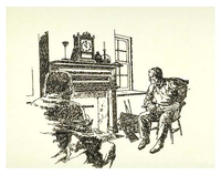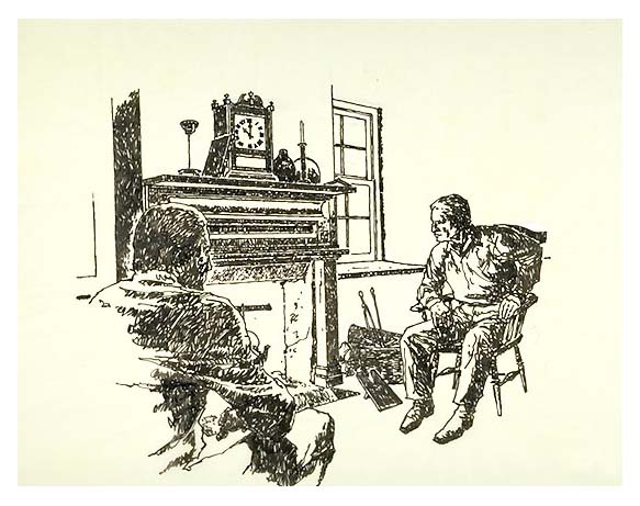 sitting by fireplace.