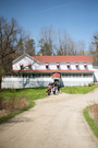 Photograph of a dirt road leading to the front entrance of Ketle Falls Hotel with a red roof, red-and-white striped awnings, and a screened-in porch.