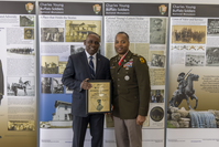 General Robert Crear (left) and Lt. Colonel Samuel Dallas (right) stand in front of park banners for a photo. General Crear holds the first-ever Arrowhead Award which was presented to him for his life’s work in keeping the spirit and legacy of the Buffalo Soldiers intact as a ranking member of the instrumental Friends of Vicksburg National Military Park and Campaign.