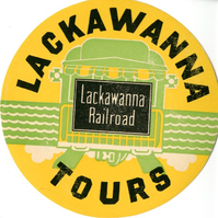 From the Museum Collection: Sticker. "Lackawanna/Tours" in black print around border of yellow disc. In center is a green drawing of an observation car deck. "Lackawanna/Railroad" in white letters within a black box is in the center of the disc. In the background is a heavy band of green and white waves. Adhesive backing. Unused. 1910-1930
