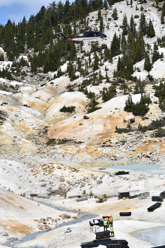 A helicopter hovers after dropping a slingload of new boardwalk material in Bumpass Hell Basin