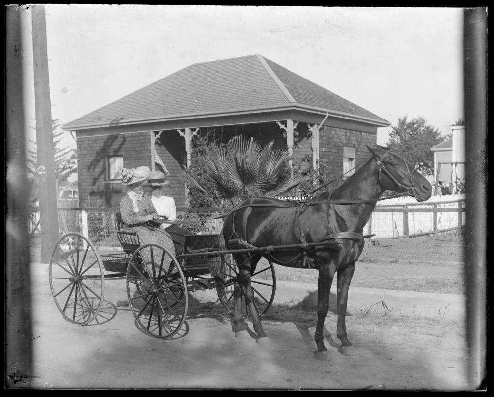 Two women posing ashore in a horse and buggy, circa 1900-1920