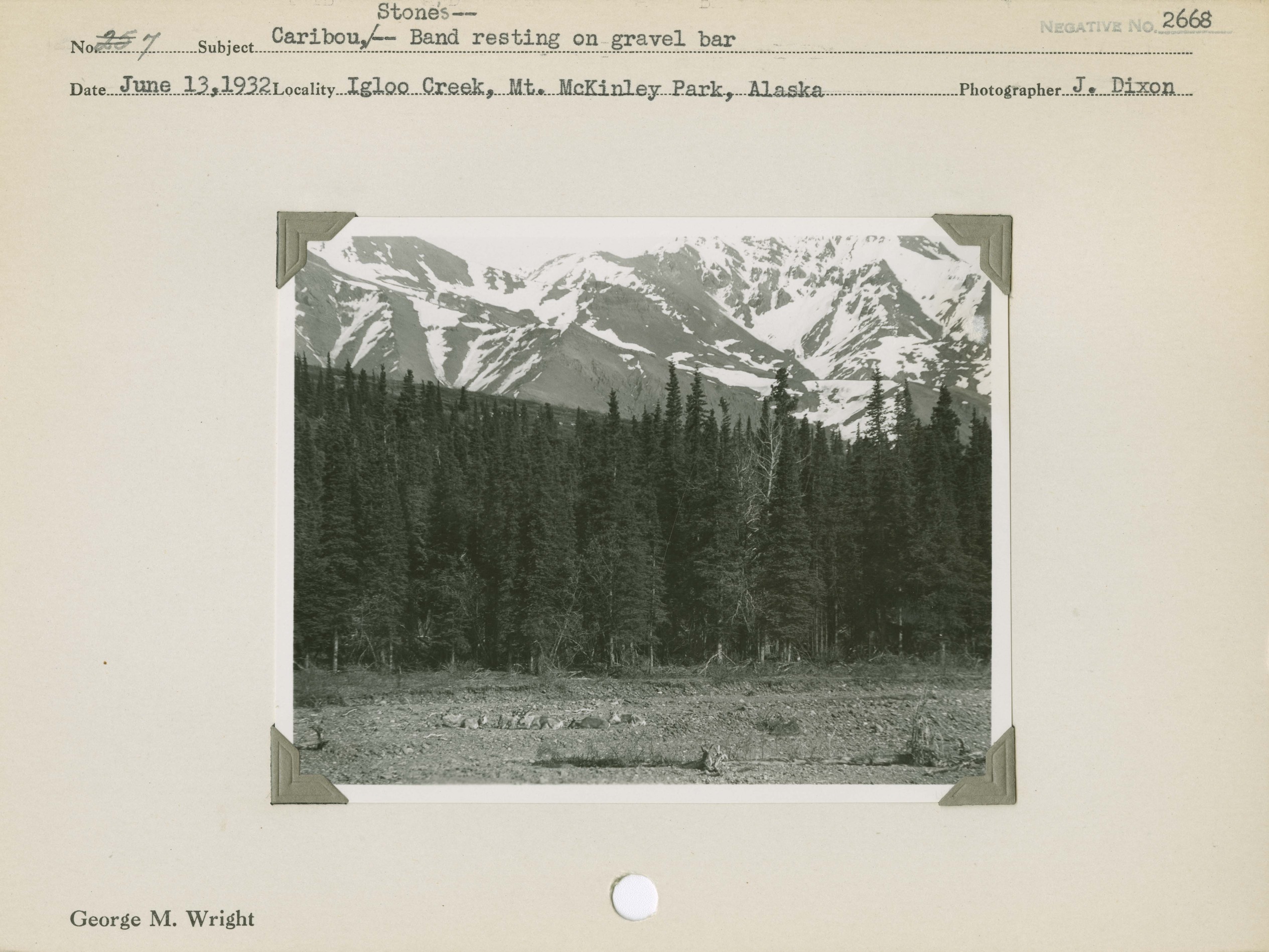 Caribou, Stones – Band resting on gravel bar. Locality: Igloo Creek, Mount McKinley [Denali] National Park, Alaska. Negative #: 2668.