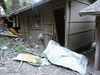 A large boulder rests beside the hard sided cabin that it crashed into. Broken windows, tree branches, and a smashed wall are in the background.