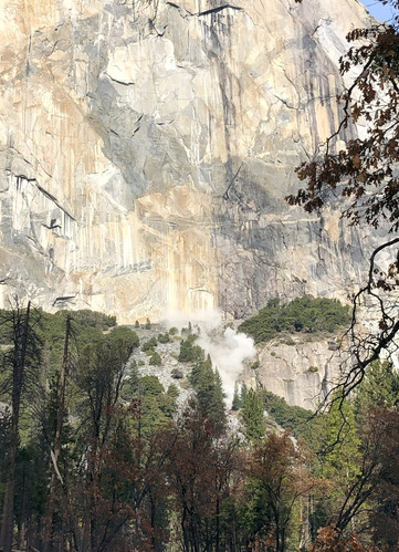 A dust cloud at the base of El Capitan produced by the impact of a free falling rock mass impacting the ground.