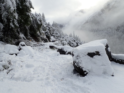 Fresh snow blankets rock fall debris covering a road.