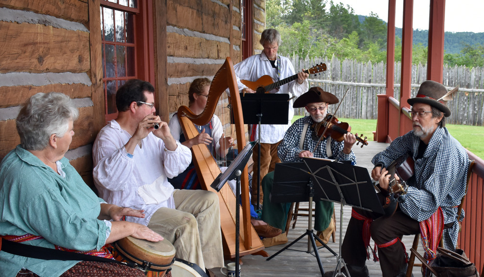 People wearing historic clothing, gathered on a porch, playing historic musical instruments.