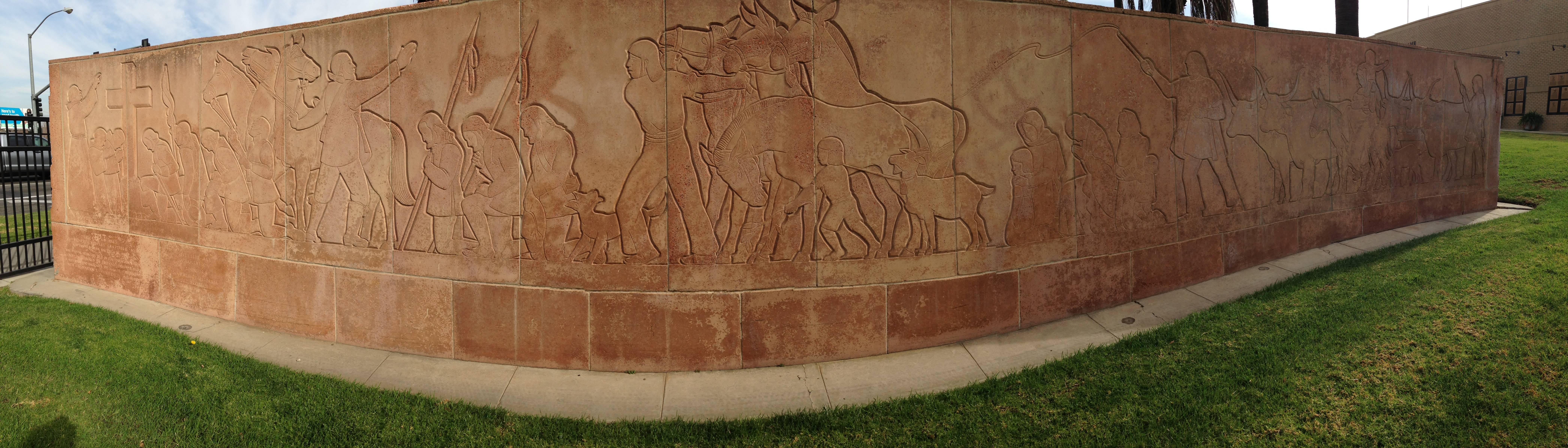 A stone wall is carved with pictures of a priest, soldiers praying, and horses and mules
