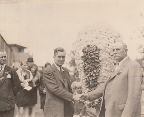 Charles Edison greeting unidentified man at ceremony initiating Postal Service from Menlo Park.