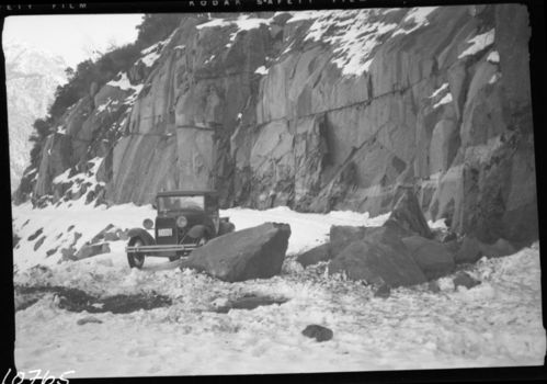 Kings Canyon, Sequoia Nat. Forest, Vehicle and equipment, floods and storm damage, roads. Kings Canyon road rockslide near Yucca Point.