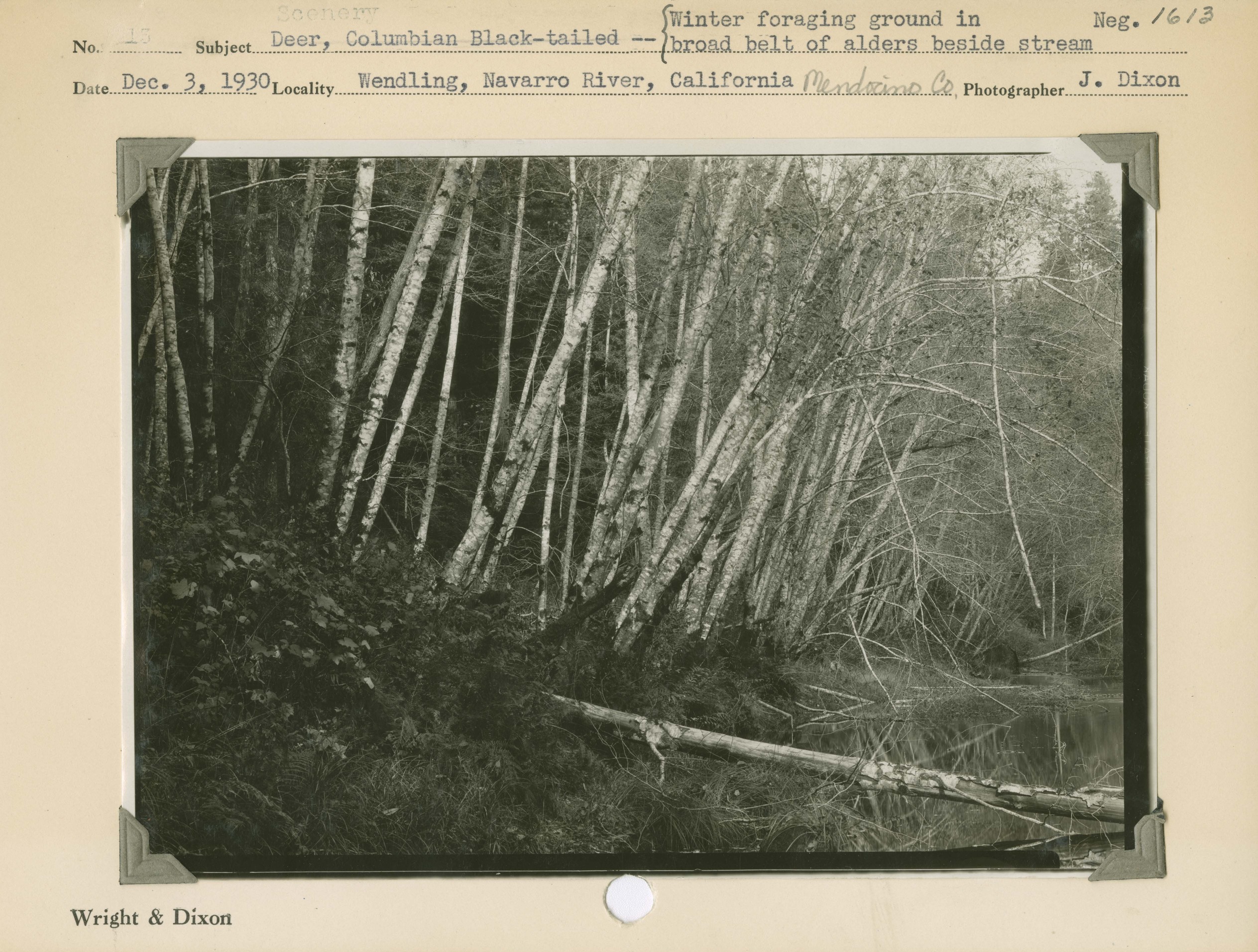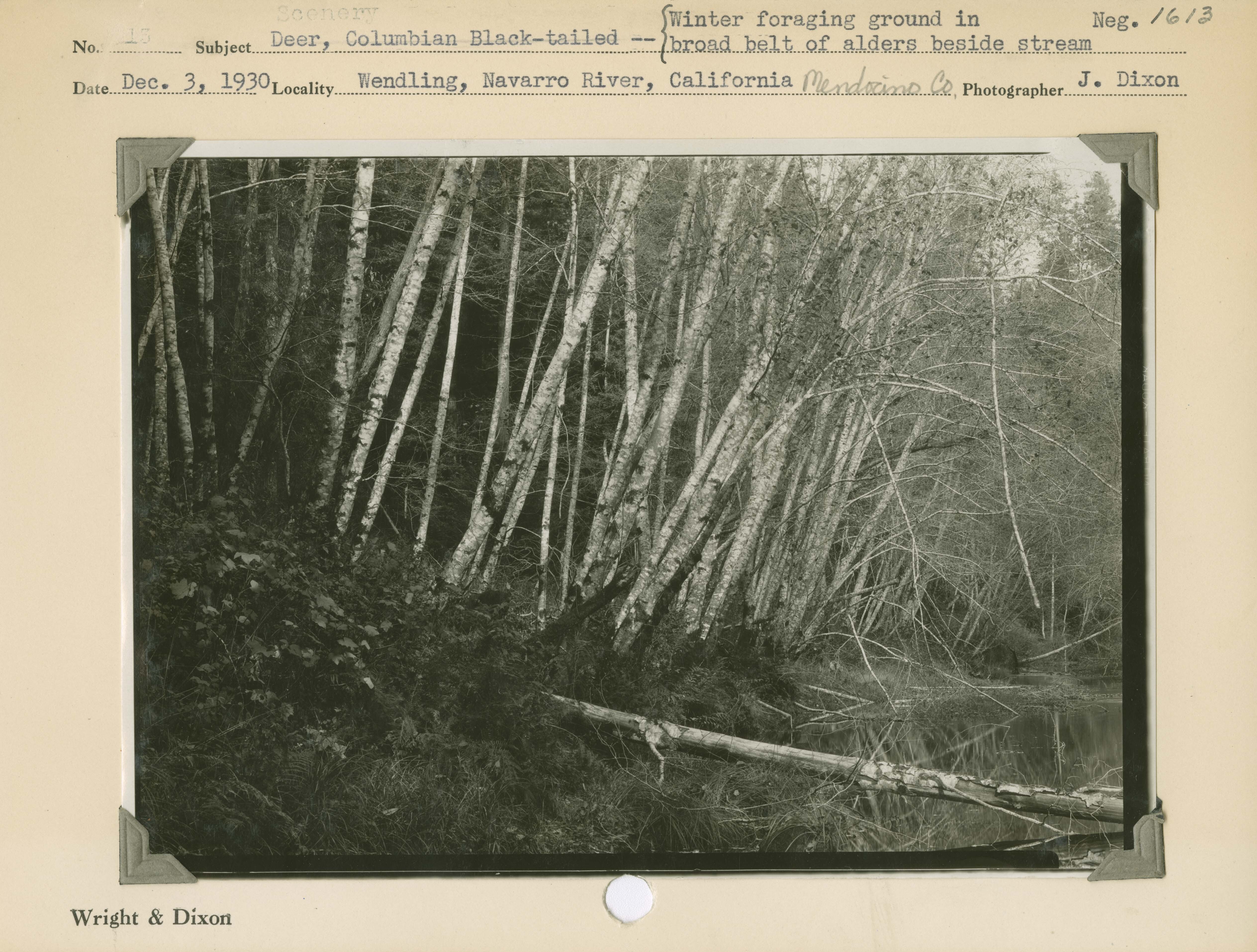 Deer, Columbian Black-Tailed: Winter foraging ground in broad belt of alders beside stream. Locality: Wendling, Navarro River, California, Mendocino County. Negative: 1613.