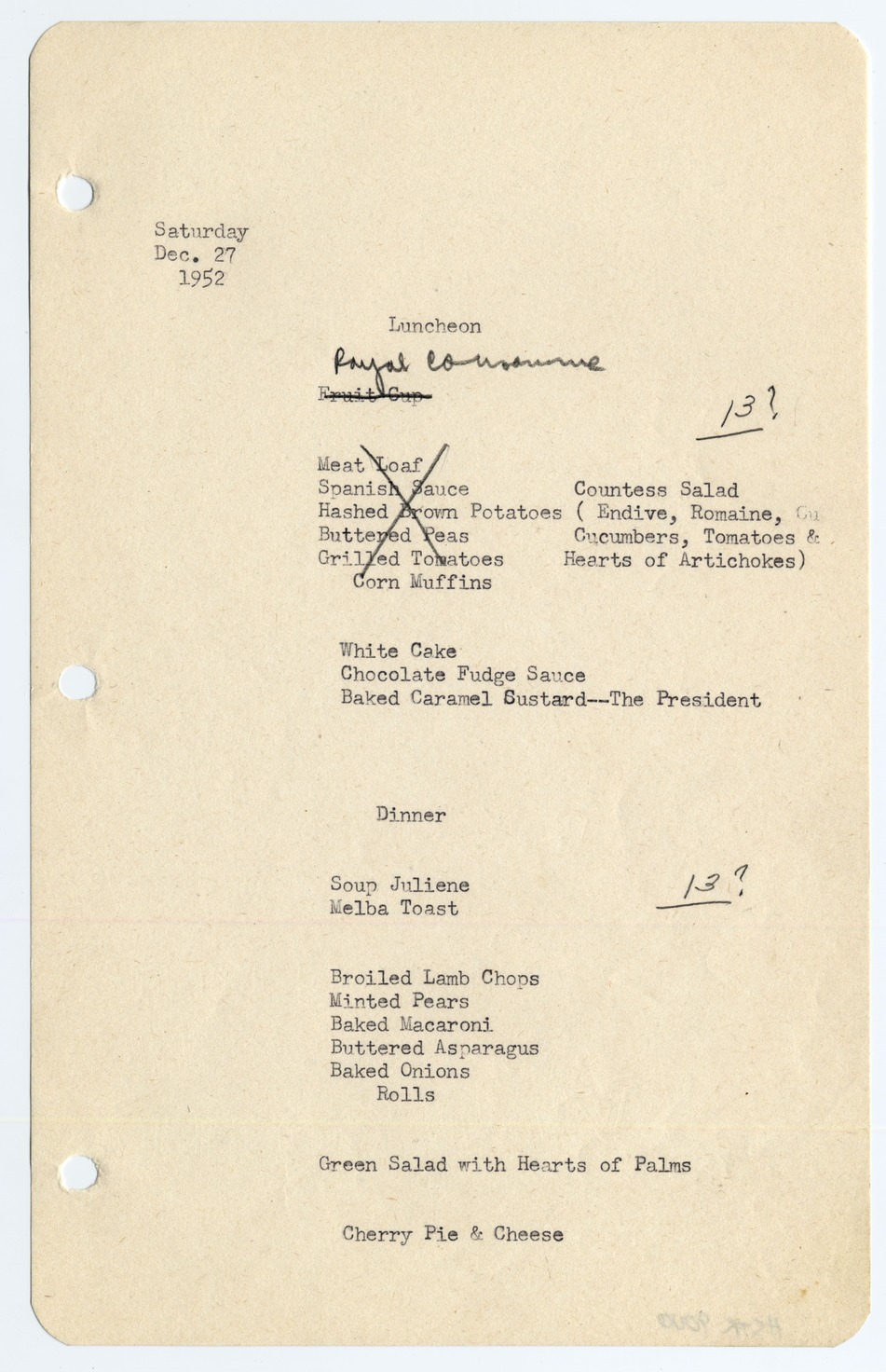 Menus for the Truman's time in the White House from November 1952 to January 1953. There are 81 menus in total. Menus consist of lunch and dinner everyday, including special meals like Cabinet dinners, Thanksgiving, and Christmas meals. Some of the meals have edits made in pencil or notes about how many people and who is going to be gone for the meal.
