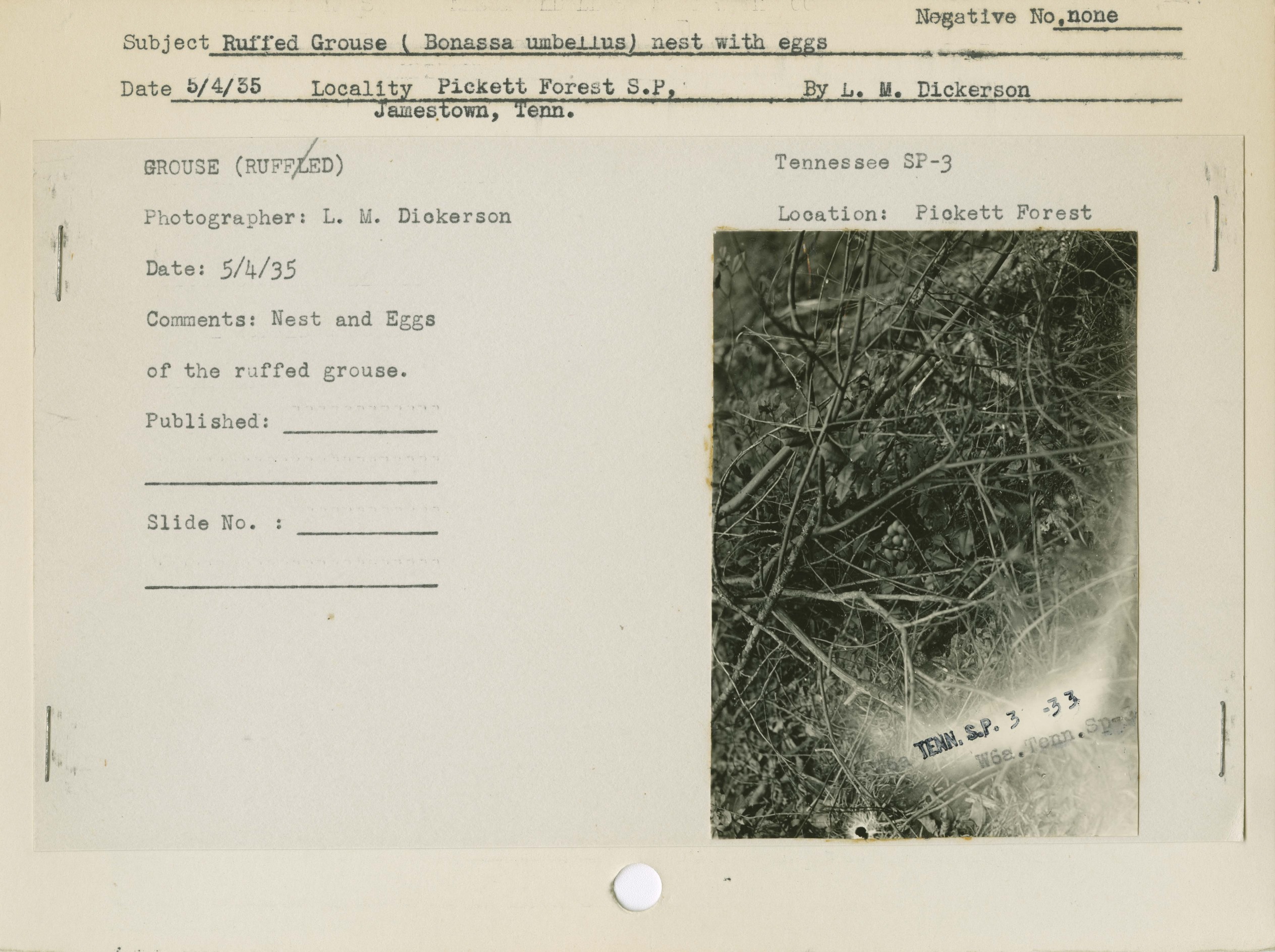 Ruffed Grouse (Bonassa umbellus) nest with eggs. Locality: Pickett Forest State Park, Jamestown Tennessee. No negative on file.