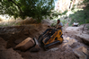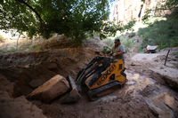 An NPS employee on a construction vehicle removes a large rock on a trail