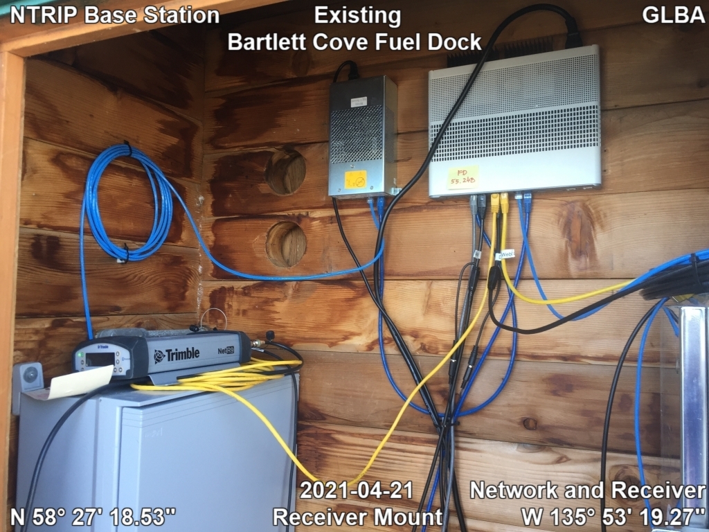 Existing NTRIP base station receiver mount at GLBA Bartlett Cove Fuel Dock.