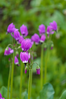 Closeup view of a wildflower with bright purple petals that sweep up and backwards instead of hanging forwards.
