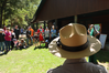 A park ranger's tan flat hat in focus in the foreground while a small crowd is gathered on a lawn in the background.