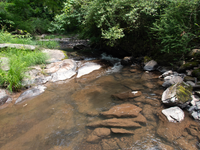 Site visit photo showing the upstream (UP) or downstream (DN) view of a wadeable stream reach taken during fish monitoring at Delaware Water Gap National Recreation Area.