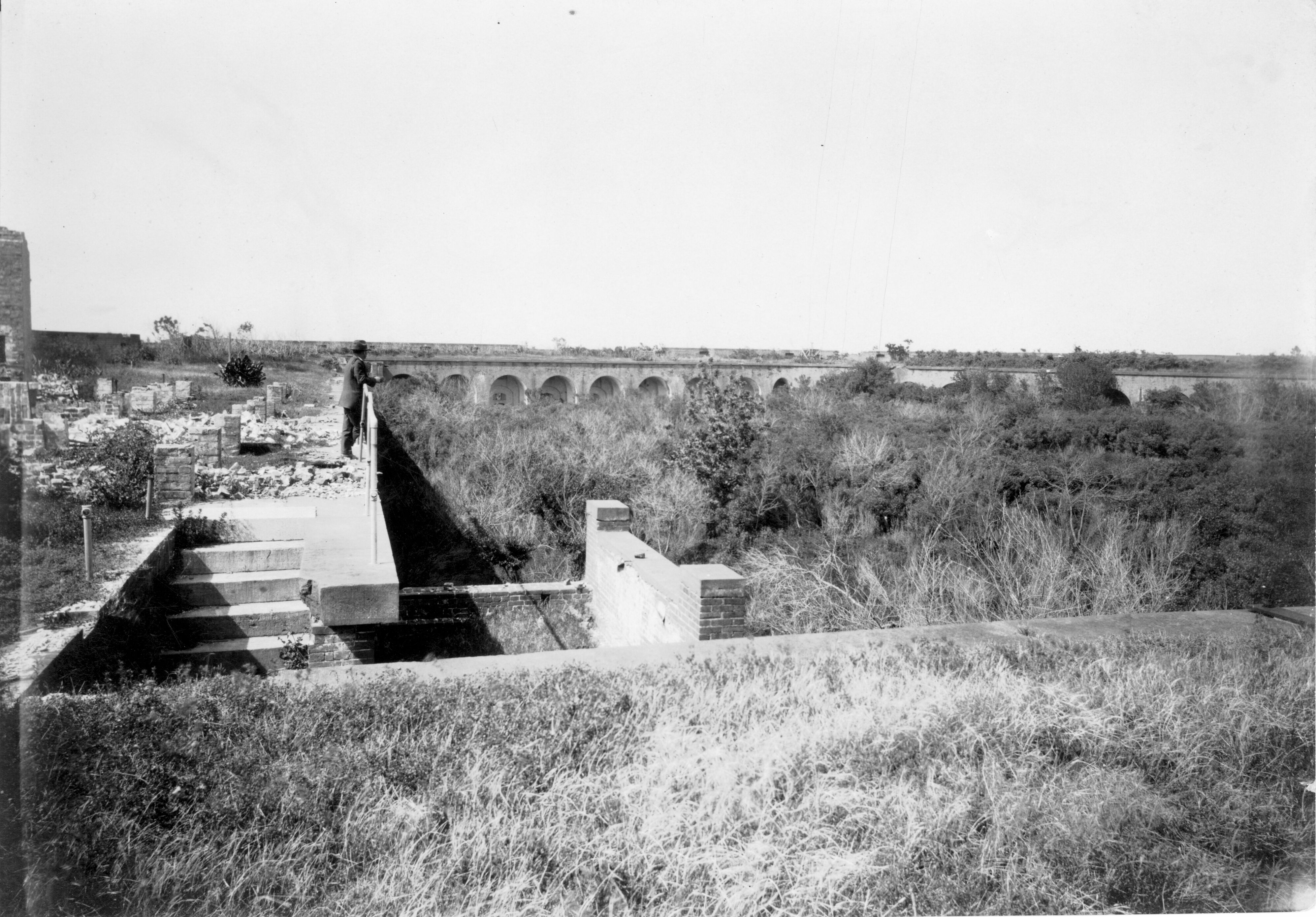 Interior of Fort Pulaski before CCC restoration, 1925. The remains of the lighthouse keeper’s house can be seen on the left. The CCC spent nine years on the island removing trees and restoring the fort to its 19th century appearance, as it is seen today.