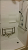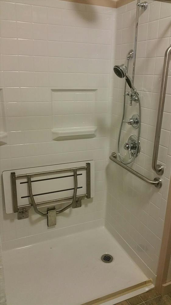 New ADA shower stall, wheel in access, bench, bar assists, mobile shower wand