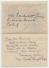 A card with an illustration of flowers and birds on the front. Inside is a note written in blue ink and an address written in pencil.