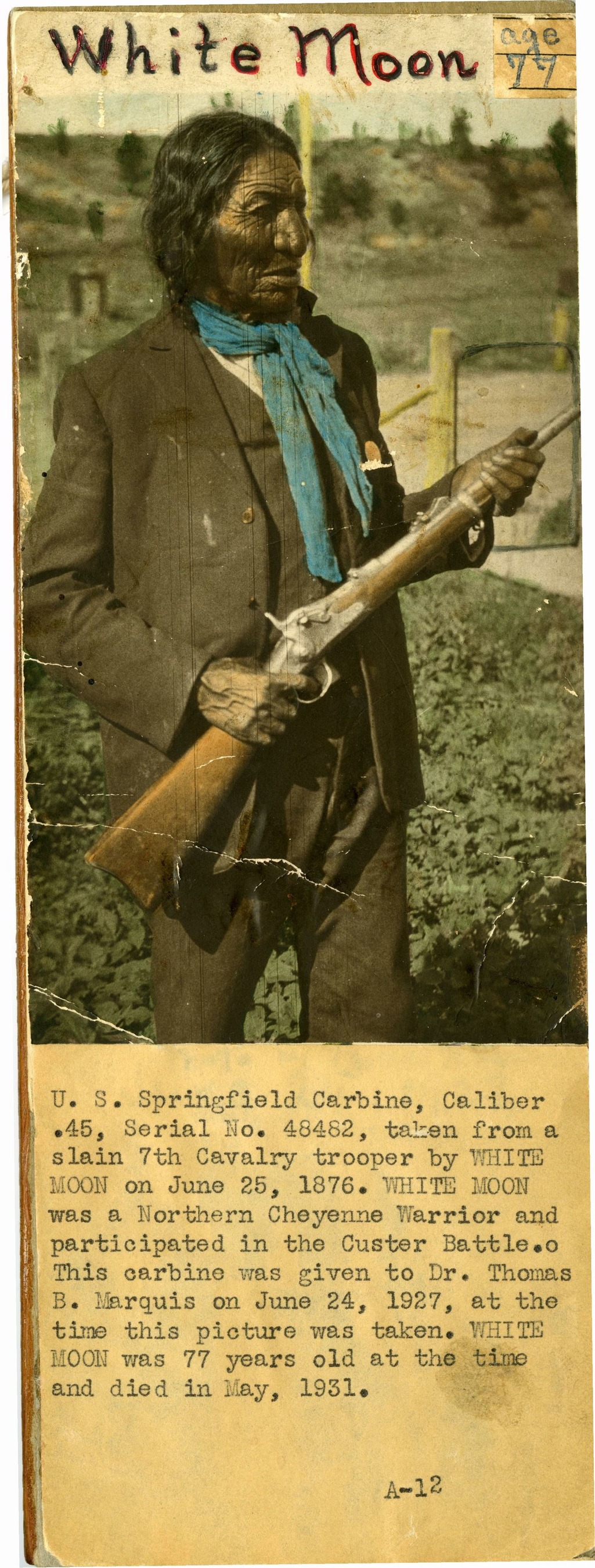 LIBI_00012_07526; A hand-tinted photograph, mounted on wood, of White Moon holding a S. S. Springfield carbine, at the Custer battlefield; produced by Thomas b. Marquis on June 24, 1927. The typewritten description below image reads, "U.S. Springfield carbine, caliber.45, serial no. 48482, taken from a slain 7th cavalry trooper by White moon on June 25, 1876. White Moon was a northern Cheyenne warrior and participated in the Custer battle. This carbine was given to Dr. Thomas B. Marquis on June 24, 1927, at the time this picture was taken. White Moon was 77 years old at the time and died in May 1931."; print, photographic [mounted on wood]; Courtesy of the National Park Service, Little Bighorn Battlefield National Monument, LIBI_00012_07526, Thomas B. Marquis, "White Moon Holding Springfield Carbine," June 24, 1927