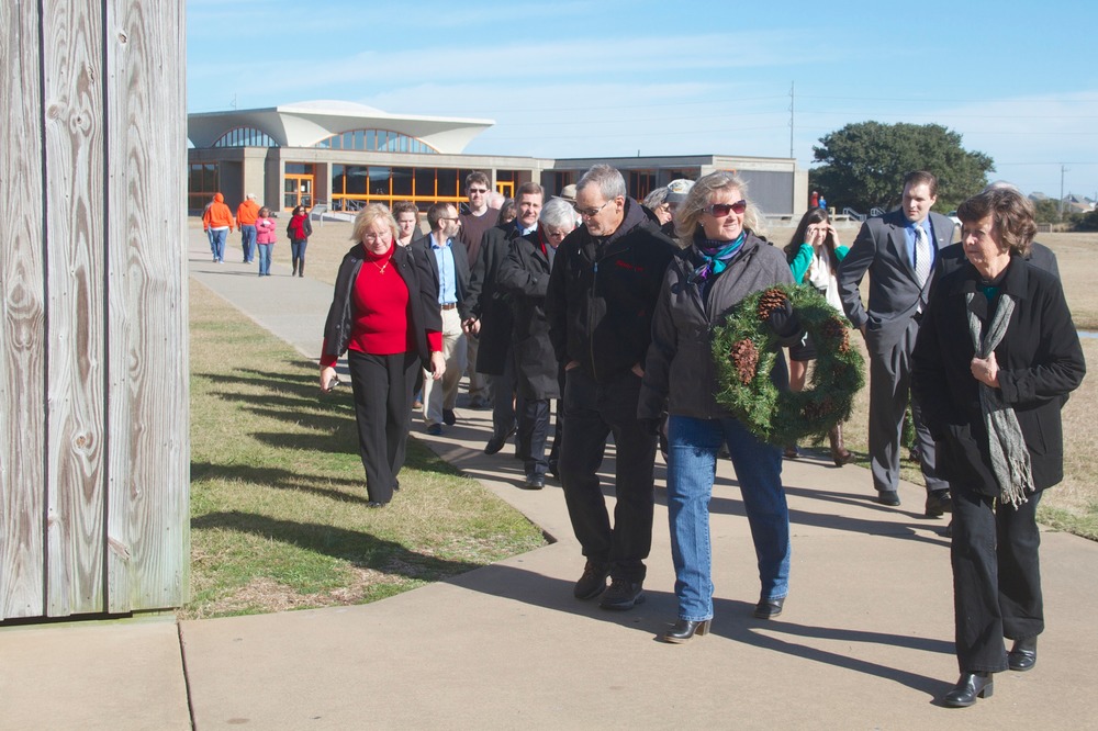 Descendants of the witnesses to the first flights walk out to the First Flight Boulder to lay wreaths in honor of the Wright brothers.