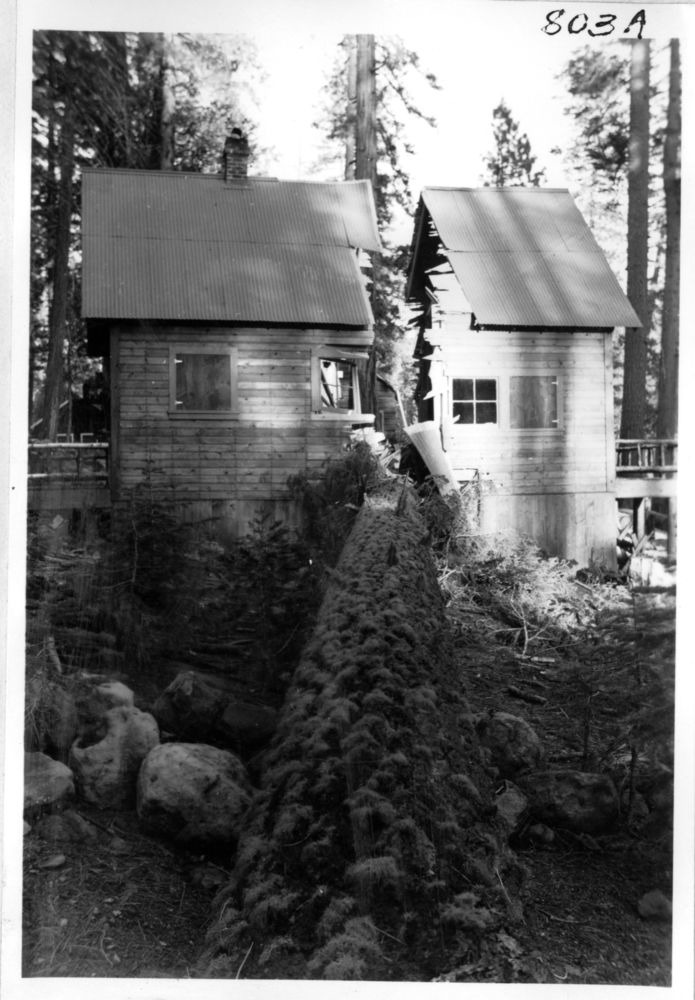 Administrative Collections: Album 9 (Miscellaneous) -Cabin at Mineral and house at Mill Creek both bisected by wind-thrown conifers