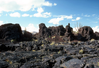 a bluish black lava flow with sparse vegetation in front of several large black and reddish rocky outcrops