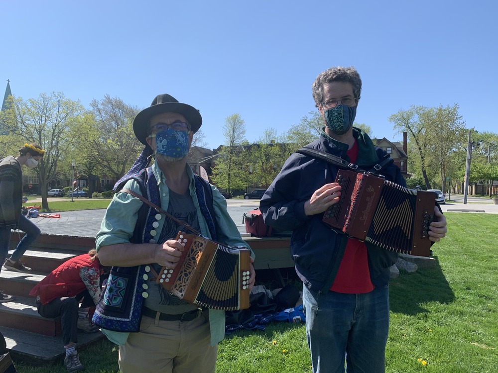 Two white men hold accordions in their hands outside standing on grass in front of a wooden band stand. Behind them, tree have just started to bloom with green leaves.