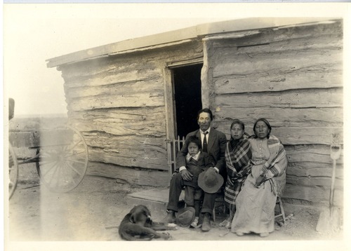 Courtesy of the National Park Service, Little Bighorn Battlefield National Monument, LIBI_00312_11079, Unknown Photographer, "Lakota Family in Front of a Log Cabin," circa 1900