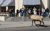 Bull elk with full set of antlers in walking up on the sidewalk in front of a restaurant with many onlookers.