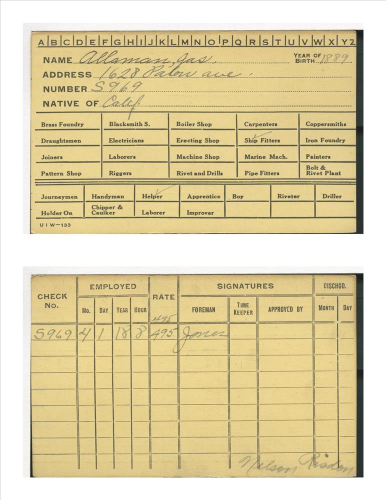 Union Iron Works Co. employee card for Jas. Allaman