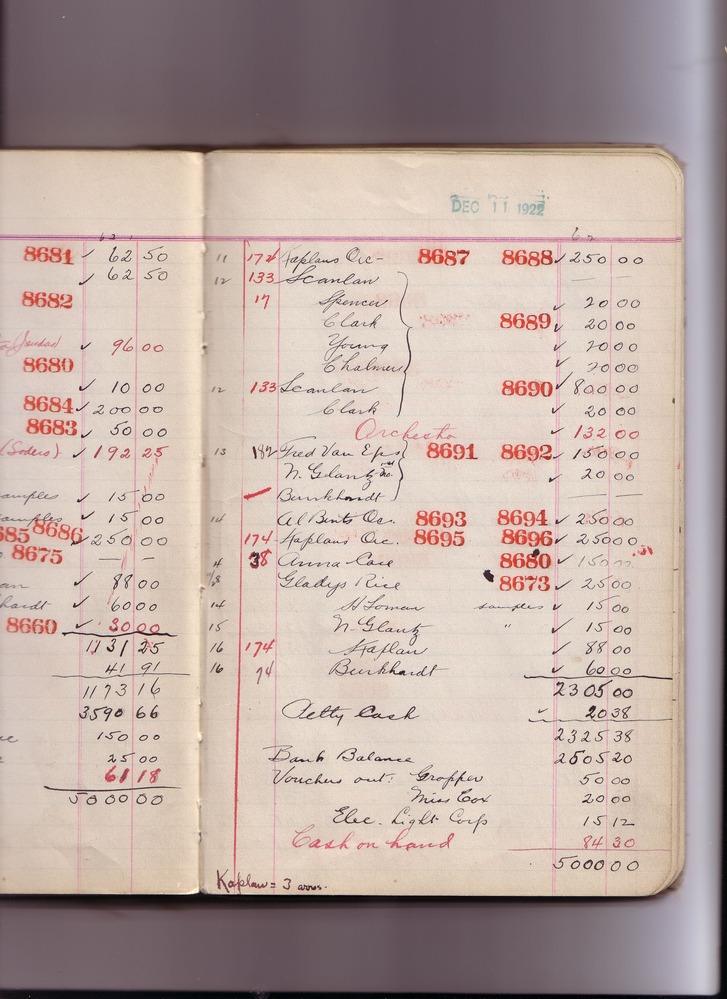 Some of the markings made in pencil in these cash books were made by ENHS Curator Leah Burt during the 1970s and/or early 1980s. For Leah Burt handwriting examples see pages for: December 19, 1921 (cash book 17) ; February 12, 1923 (cash book 17) ; October 27, 1924 (cash book 18) ; December 01, 1925 (cash book 19).