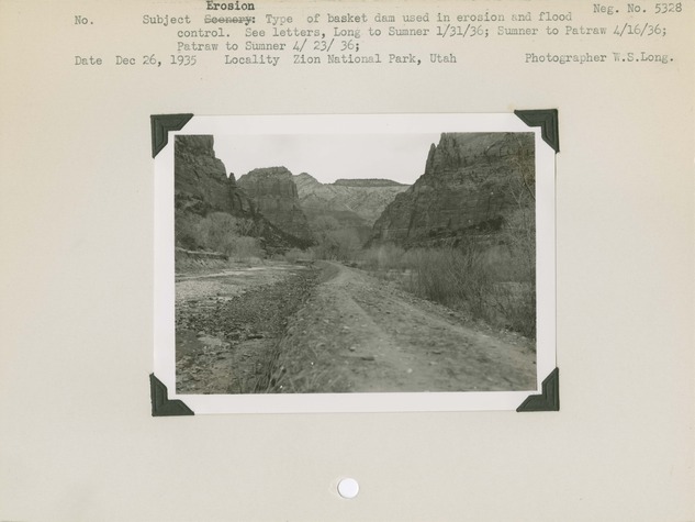 Erosion: Type of basket dam used in erosion and flood control. See letters, Long to Sumner 01/31/1936; Sumner to Patraw 04/16/1936; Patraw to Sumner 04/23/1936. Locality: Zion National Park, Utah. Negative #: 5328