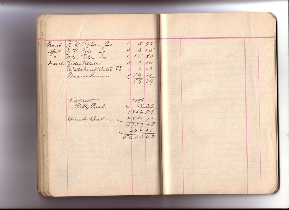 Some of the markings made in pencil in these cash books were made by ENHS Curator Leah Burt during the 1970s and/or early 1980s. For Leah Burt handwriting examples see pages for: December 19, 1921 (cash book 17) ; February 12, 1923 (cash book 17) ; October 27, 1924 (cash book 18) ; December 01, 1925 (cash book 19).