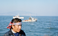 Indian occupier wearng headband in foreground with Coast Guard boat idling behind a short distance away