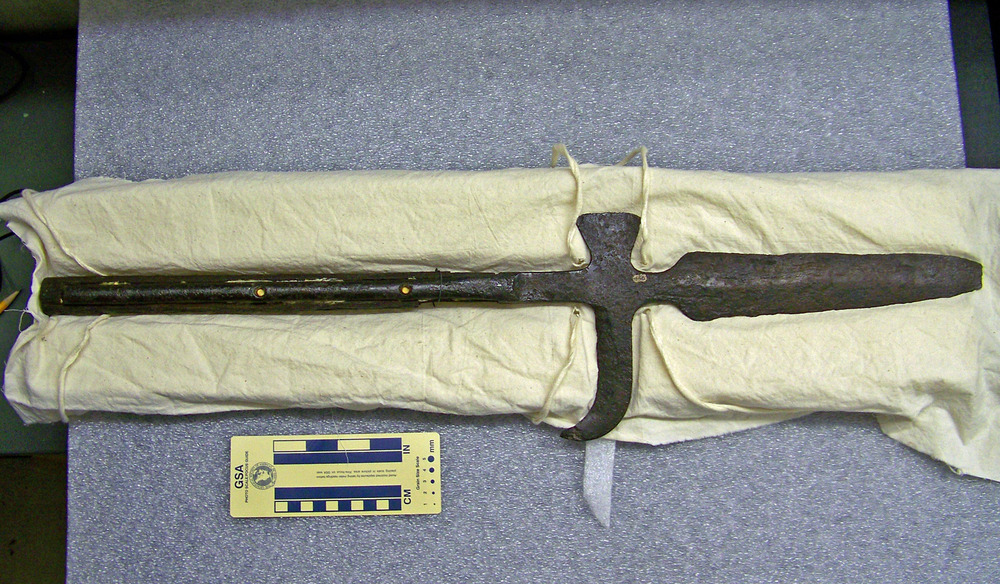 Halberd, Spanish, supposed artifact of DeSoto expedition through Arkansas; iron head, wooden handle banded in iron; head has spear-like point on end (with broken tip), small ax blade on one side, curved hook on opposite side; accompanied by image of John Fordyce drawing of original, sent to HOSP by Dr. Anne Early, Arkansas State Archeologist, in October 2011 (original drawing in archives at University of Arkansas - Fayetteville). Curator's Notes from 8/7/2014 and 10/15/2014: Halberd has been examined by Dr. Jeffrey Michem of AAS and determined likely to be an actual weapon from the DeSoto expedition and Spanish in origin.