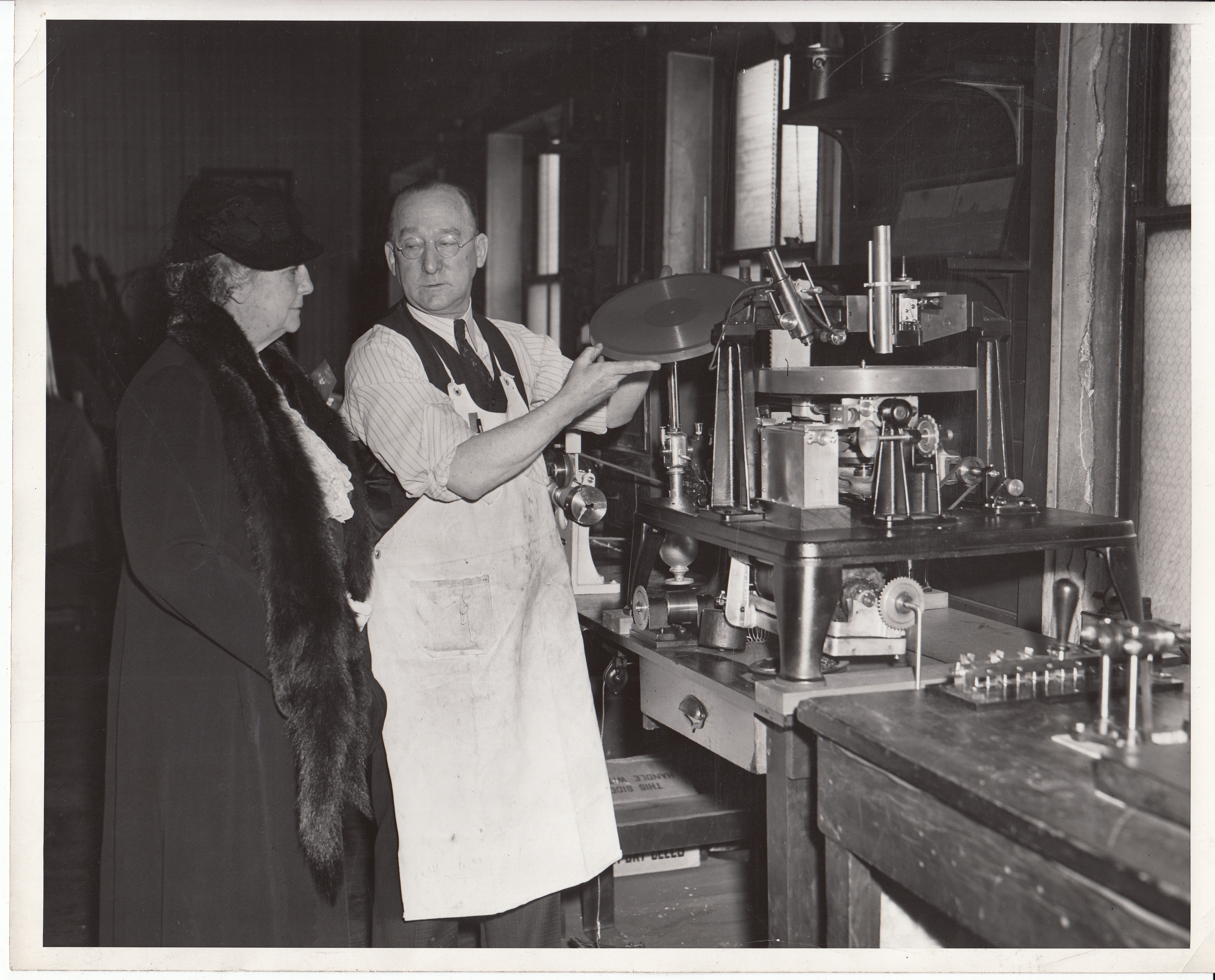 Mina Edison and William Hayes examining disc record-making machine [in Building 5 or Phonograph Works building?].